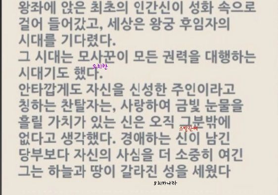결국 둘의 맹세는 애초부터 이루어지기 힘든것이였고 인간과 용의 뿌리깊은 갈등은 결국 오치칸이 성왕이 되면서 폭발하게됨